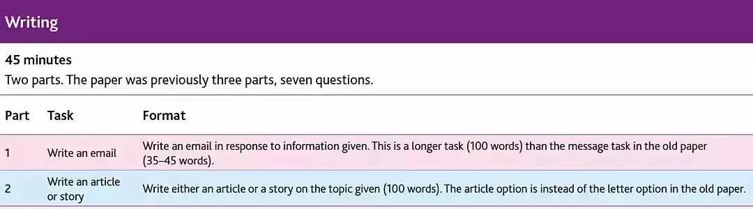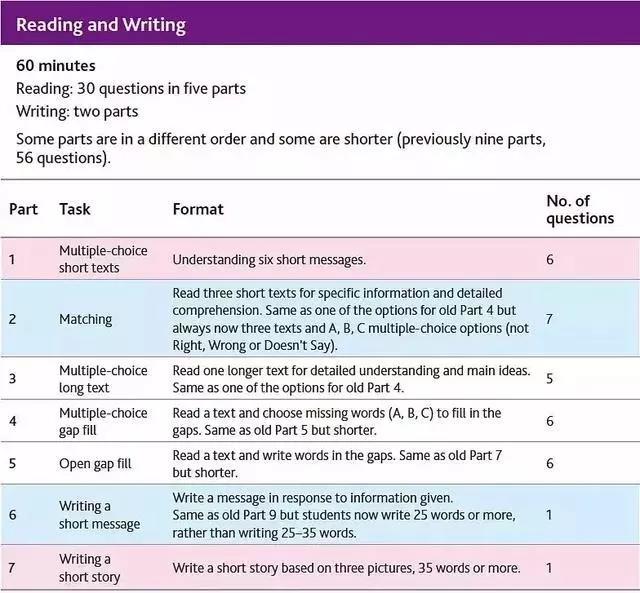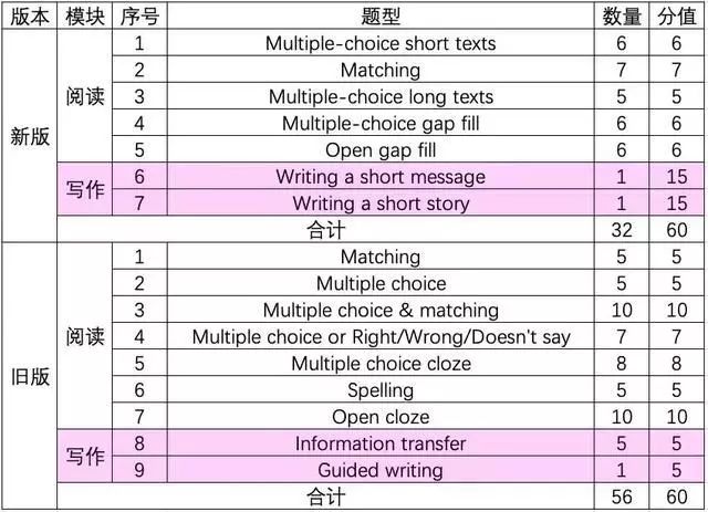 新版PET考試最大的變化就是閱讀與寫作模塊分離,各自有45分鐘答題時間;聽說讀寫4個模塊分值占比均為25%。改版前后各模塊情況對比如下: