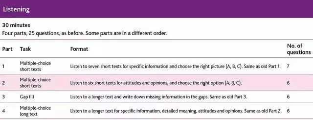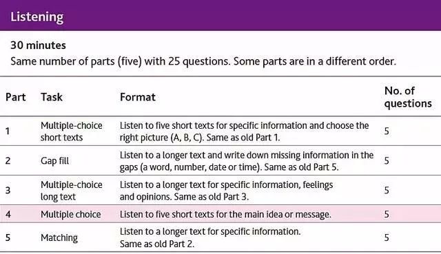 變化最大的是Part 4為新增題型,要求考生理解5段內(nèi)容的主旨思想或觀點態(tài)度,幫助考生開始適應(yīng)PET、FCE的考察方向;此外,Part 3關(guān)于對話信息的考察也從舊版關(guān)注回答轉(zhuǎn)向關(guān)注問答雙方。