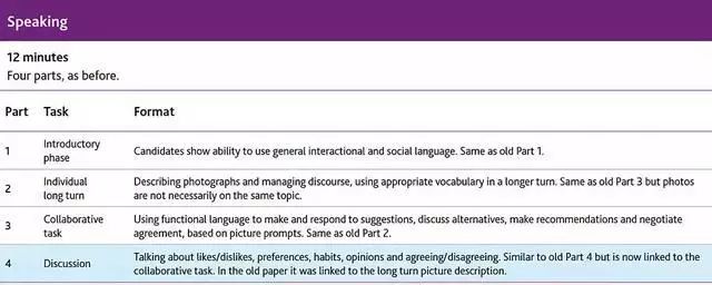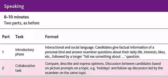 口語模塊雖然仍然是兩個部分,但Part 2新版寫作討論題增加不少難度,題型接近于PET口語題型之一。