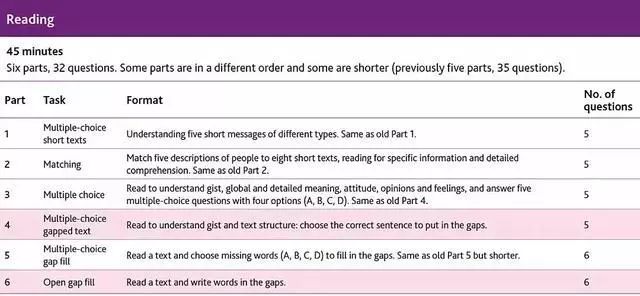 Part 2:匹配題改自舊版的Part 4,閱讀材料由舊版的1個長篇變成3個短篇,每題3個備選項;近似PET閱讀題型之一。