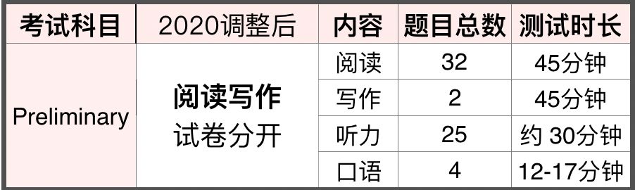 這次考試改革的重要方向是為了幫助學(xué)員在劍橋英語(yǔ)的不同難度級(jí)別間平穩(wěn)過(guò)渡,順暢對(duì)接,所以2020年1月開(kāi)始KET和PET兩個(gè)級(jí)別的題型均做了調(diào)整。
