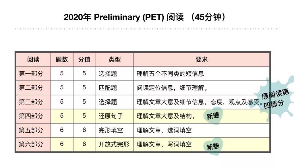 PET閱讀第四部分“補(bǔ)全文章”(類(lèi)似于FCE閱讀第六部分)為新增題目;