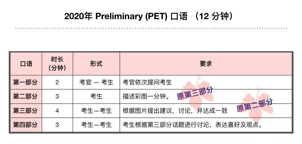 PET口語(yǔ)仍為四個(gè)部分,但是順序上做了些調(diào)整,即第二和第三部分做了對(duì)調(diào),第四部分是第三部分的話(huà)題延伸??倳r(shí)長(zhǎng)依舊為12分鐘。